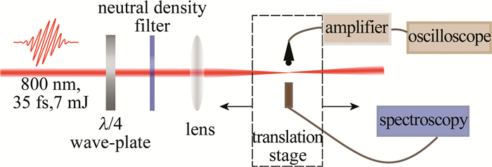 實(shí)驗(yàn)裝置如圖 1所示,以獲得飛秒激光成絲過程中的熒光輻射光譜和聲音信號(hào)。實(shí)驗(yàn)中采用的飛秒激光器型號(hào)為Astrella(Coherent, Inc.),該系統(tǒng)可輸出中心波長(zhǎng)為800 nm、脈沖時(shí)間寬度為35 fs、單脈沖較大能量為7 mJ、重復(fù)頻率為1 Hz~1000 Hz可調(diào)的線偏振激光脈沖。激光器發(fā)射出的重復(fù)頻率為1000 Hz的激光經(jīng)過λ/4波片、中性密度濾光片后,被焦距為40 cm的透鏡聚焦,在空氣中產(chǎn)生光絲。在光絲的垂直方向上由光纖將熒光信號(hào)引入光譜儀,測(cè)量光絲的熒光光譜。光譜儀型號(hào)為USB4000(Ocean Optics, Inc.),光譜每次測(cè)量的積分時(shí)間為1.5 s,平均次數(shù)為5次。控制電動(dòng)位移臺(tái)使組裝在其上面的光纖探頭沿激光傳播方向移動(dòng),以獲得等離子體光絲不同位置處的熒光信號(hào)。轉(zhuǎn)動(dòng)波片控制激光的偏振態(tài)實(shí)現(xiàn)由線偏振到圓偏振的演化。調(diào)節(jié)中性密度濾光片可連續(xù)改變激光脈沖能量,以獲得不同激光脈沖能量下的熒光信號(hào)。測(cè)量過程中以熒光信號(hào)出現(xiàn)的位置為等離子體光絲傳輸?shù)牧泓c(diǎn),位移臺(tái)每移動(dòng)1 mm收集一次信號(hào),直至熒光信號(hào)消失。