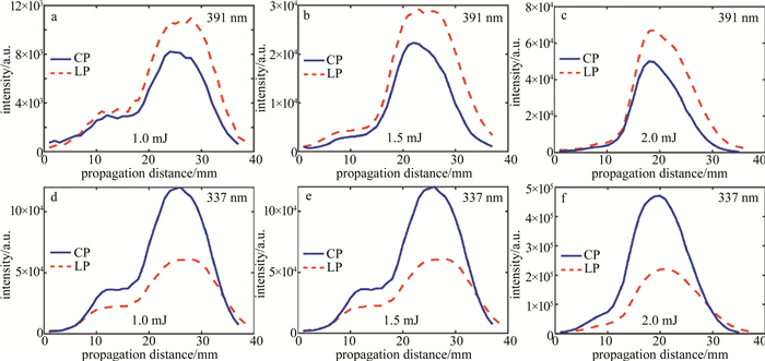 沿著光的傳播方向移動(dòng)光纖探頭,可以測(cè)量飛秒光絲不同位置處的熒光信號(hào)。如圖 3所示,為入射激光能量分別為1.0 mJ,1.5 mJ和2.0 mJ時(shí),激光的偏振態(tài)分別為線偏振和圓偏振情況下,測(cè)量得到391 nm處的N2+熒光信號(hào)強(qiáng)度和337 nm處的N2熒光信號(hào)強(qiáng)度隨光傳輸距離的變化。可以發(fā)現(xiàn),在3種不同的入射激光能量下,光絲中心位置處337 nm的熒光信號(hào)在圓偏振光作用下的強(qiáng)度約為線偏振態(tài)下的2倍,而391 nm的熒光信號(hào)則是在線偏振態(tài)下的強(qiáng)度約為圓偏振光下的1.3倍。隨著入射激光單脈沖能量的增加,熒光強(qiáng)度的較大值在逐漸增加。