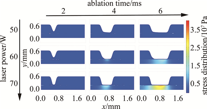 縱向觀察發現,燒蝕時間恒定,燒蝕深度隨著激光功率的增大逐漸增大,同時,燒蝕區域底部對應的保護膠與鋁合金的結合界面處出現了應力集中現象,而應力集中點也隨著激光功率的增大而顯著增多;其中燒蝕時間為4 ms、6 ms,激光功率為60 W、70 W時,保護膠與鋁合金的結合界面處開始出現應力集中現象,且應力集中區隨著激光掃描路徑延伸逐漸擴大,應力至高點出現在掃描區域的中心位置,且對鋁合金基體材料產生了應力影響。橫向觀察發現,激光功率為50 W時,整個燒蝕過程中沒有出現特別明顯的應力集中區,這是因為激光功率較小時,保護膠材料不能被完全燒蝕,所以保護膠與鋁合金的結合界面處并未產生明顯應力;同燒蝕深度的變化規律,其應力影響區域面積與應力數值也隨著激光功率的增大而增大。仿真計算結果表明:激光功率越大,燒蝕深度越深;激光焦點距保護膠與鋁合金的結合界面處越近,界面處產生的應力就越大,由于鋁合金是熱的良導體,較高的傳熱性能使其在激光刻型時,容易產生更大范圍的應力區域與更高的應力值。
