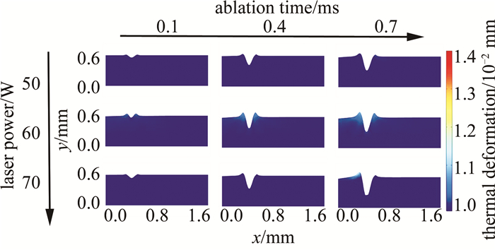 6為不同激光功率對保護膠刻型形貌的影響示意圖。以激光功率為變量,分別選取50 W, 60 W, 70 W為參數節點,根據激光燒蝕時間選擇3個時間節點分別為0.1 ms, 0.4 ms, 0.7 ms。在9個仿真結果中,材料因熱應力而產生的位移通過顏色圖例顯示,至高為1.4×10-2 mm,低為0.98×10-2 mm。