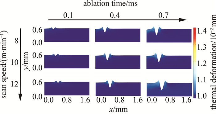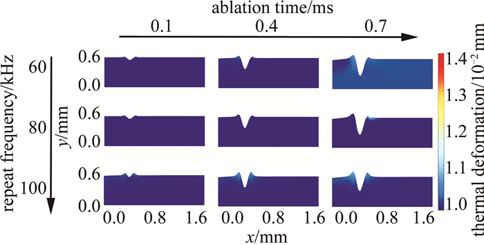 8是以重復頻率為變量的仿真結果。分別選取60 kHz80 kHz、100 kHz為參數節點, 其余仿真條件如下:激光功率為60 W、掃描速率為10 m/min。燒蝕時間節點選擇與圖例設置同圖 6。觀察圖 8發現,掃描時間恒定時,重復頻率以選取的參數節點變化; 重復頻率為60 kHz80 kHz時,切口形貌、燒蝕深度無明顯變化,當重復頻率達到100 kHz時,形貌變化較明顯,且切口處產生了較大的熱變形現象。