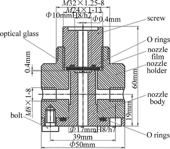 耦合裝置是實現激光與微水束耦合并傳輸的關鍵部件。耦合裝置主要由噴嘴體、進水孔、O型圈、噴嘴支架等組成,如圖 2所示。本文中將噴嘴設計成圓柱形,目的是為了延長微水束的破碎長度。考慮到激光的能量密度比較大,且激光要在噴嘴內部發生全反射,故噴嘴材料選用耐熱性比較好的銅。各參量具體數值為:噴嘴長度為10mm,噴嘴直徑為0.4mm,耦合間隙為0.4mm。噴嘴體頂部的定位圓柱體6與噴嘴支架4通過螺紋連接,高壓水從左右兩側的注水口注入耦合裝置,并進入噴嘴體與光學玻璃之間形成的耦合間隙,然后通過噴嘴片上的噴嘴將耦合之后的光液高能束噴射出來。圖 3為耦合裝置的實物照片。