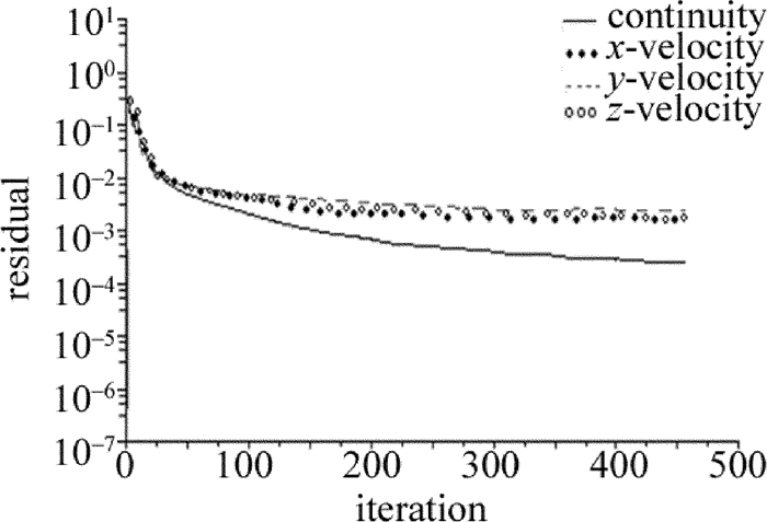 首先是殘差圖的收斂計算,設計的收斂參量為1×10-3。圖 4為殘差圖的收斂計算結果,橫坐標為迭代次數,縱坐標為殘差值的大小。圖 5為單注水口耦合腔頂部水流入口壓力分布圖,縱坐標為水束壓力大小(MPa)。由圖 5可以看出:當水束壓力為10MPa時,水流入口處壓力分布非常不均勻,具有明顯的各向異性,且注水口一側的壓力明顯較大;隨著水束壓力的不斷增大,水束壓力的各向異性逐漸減弱,在水束壓力達到20MPa時,入口的水壓趨近均勻。